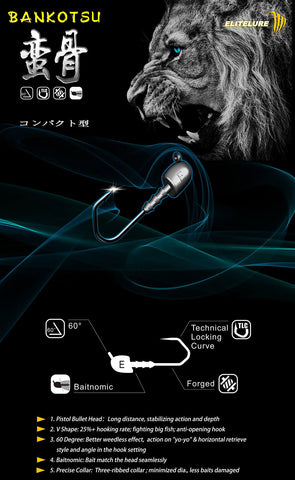 Elitelure Bankotsu jighead, una testina piombata top performance, progettata con tutti gli accorgimenti possibili per ottenere un prodotto davvero unico. La testa a proiettile, favorisce una grande distanza di lancio e stabilizza al tempo stesso la traiettoria dell'artificiale quando si recupera orizzontalmente.. La particolare angolazione dell'occhiello del nodo, a 60° ottimizza il rolling, incrementa le capacità di direzionare la punta dell'amo verso il labbro superiore del pesce durante la ferrata, e rende l'esca incredibilmente reattiva su recuperi a yo-yo. L'amo "barbarian style hook" di queste teste piombate riduce al massimo la perdita dei pesci durante il combattimento, ed è virtualmente inapribile. Infine, una particolare attenzione è stata riservata al bait keeper, che non permette lo scivolamento accidentale dell'esca durante il lancio e al profilo interno, che ospita perfettamente la testa di esche quali grub e shad.